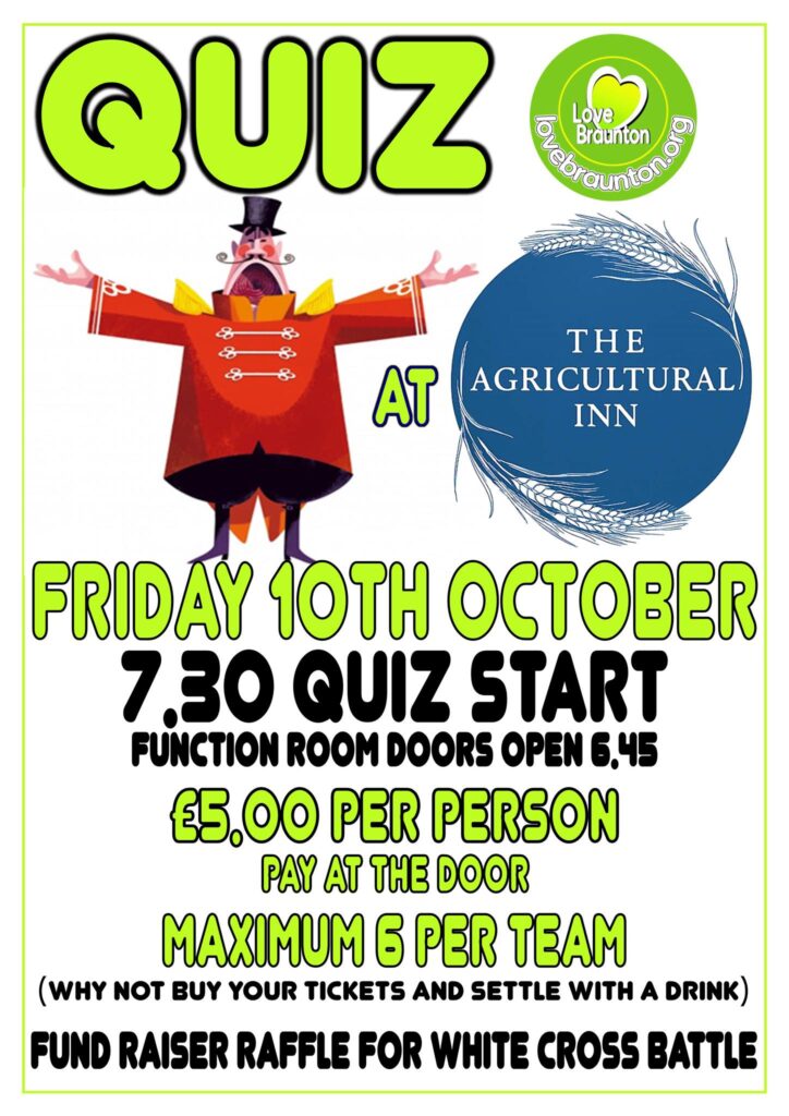 Our Autumn Quiz 2024 will be at The Aggi – Friday 22nd November at 7.30pm – tickets on the door £5 each